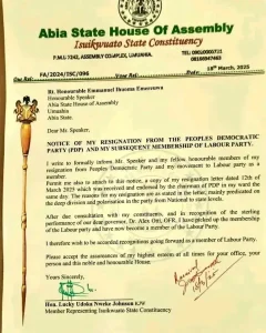 Another member of the People’s Democratic Party PDP in the Abia State House of Assembly and member representing Isuikwuato state constituency, Lucky Nweke Johnson has resigned from his party, the Peoples Democratic Party (PDP) and joined the Labour Party (LP).