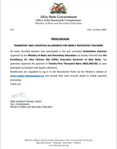 The statement further directed participants to log on to the recruitment portal via the Ministry’s website, www.mobse-abiastategov.ng to provide their bank details for payments.