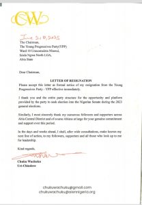 The statement reads, “Please accept this letter as formal notice of my resignation from the Young Progressives Party – YPP effective immediately. I thank you and the entire party structure for the opportunity and platform provided by the party to seek election into the Nigerian Senate during the 2023 general elections.