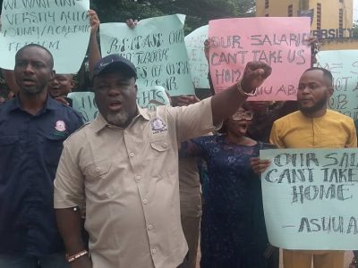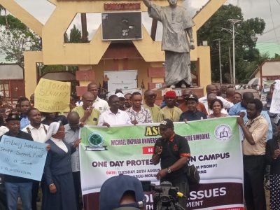 The Academic Staff Union of Universities (ASUU), branch of Michael Okpara University of Agriculture, Umudike, on Tuesday protested over what they called federal ...